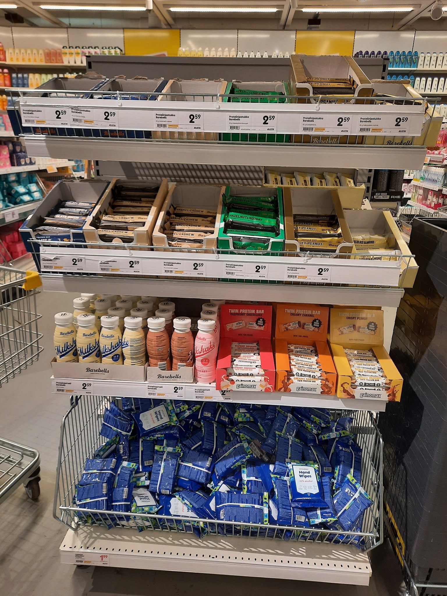 | Nämä kyltit menevät aina uutuuksien viereen. |